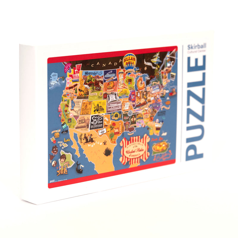 The map draws its inspiration from a love of 1950s and 1960s jigsaw puzzle maps of the United States, as well as vintage restaurant and diner placemats of the same era.
