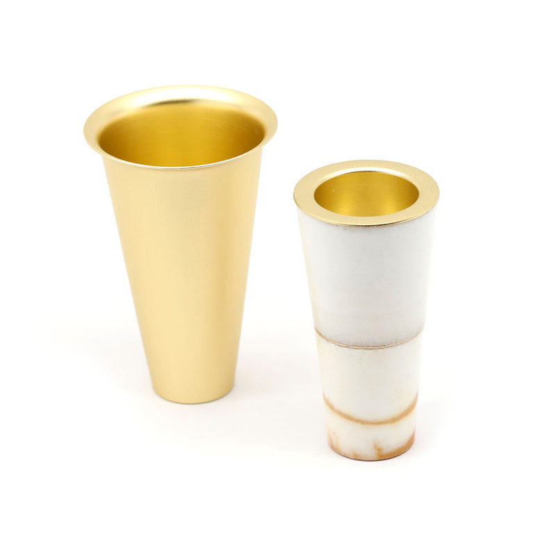 This kiddush cup set was designed in Israel and made of Dead Sea Salt combined with various earth pigment powders and copper. The gold cup is made of anodized aluminum with a satin finish.