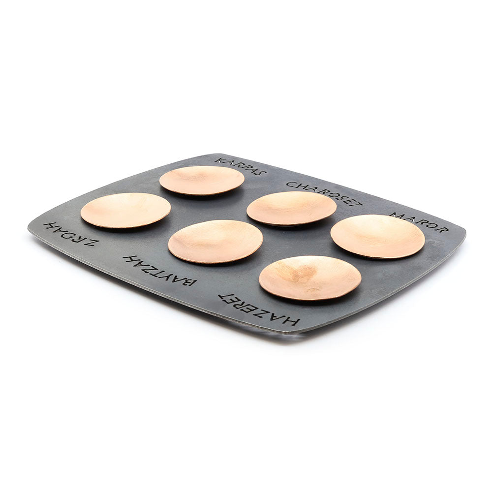 The base is a natural finish iron and the dishes are copper with a brushed oxidized finish. The dishes are 3 1/2"in diameter and rest in circles cut into the base.